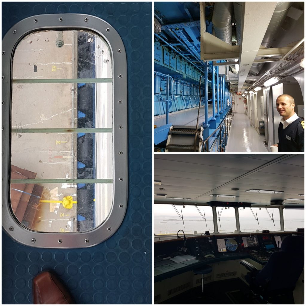 Interesting detail is the glass in the floor of the bridge which is used to put the vessel exactly at the right point at the quayside.